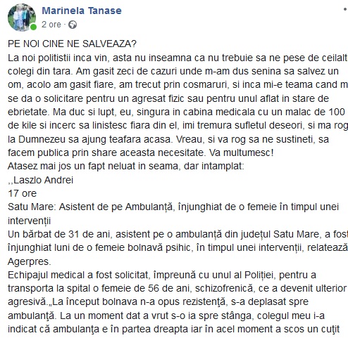 ”La noi politistii vin, asta nu inseamna ca nu trebuie sa ne pese de ceilalti colegi din tara. Am gasit zeci de cazuri unde m-am dus senina sa salvez un om, acolo am gasit fiare, am trecut prin cosmaruri, si inca mi-e teama cand mi se da o solicitare pentru un agresat fizic sau pentru unul aflat in stare de ebrietate. Ma duc si lupt, eu, singura in cabina medicala cu un malac de 100 de kile si incerc sa linistesc fiara din el, imi tremura sufletul deseori, si ma rog la Dumnezeu sa ajung teafara acasa. Vreau, si va rog sa ne sustineti, sa facem publica prin share aceasta necesitate. Va multumesc!