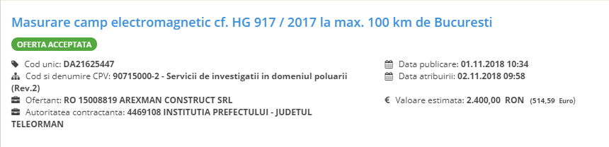 Serviciul solicitat de Prefectură: Masurarea campului electromagnetic si/sau a valorii campului electric si/sau magnetic conform HG 520/2016, 917/2017 sau 569/2016, LA SEDIUL AUTORITATII CONTRACTANTE – 20 PUNCTE MASURARE