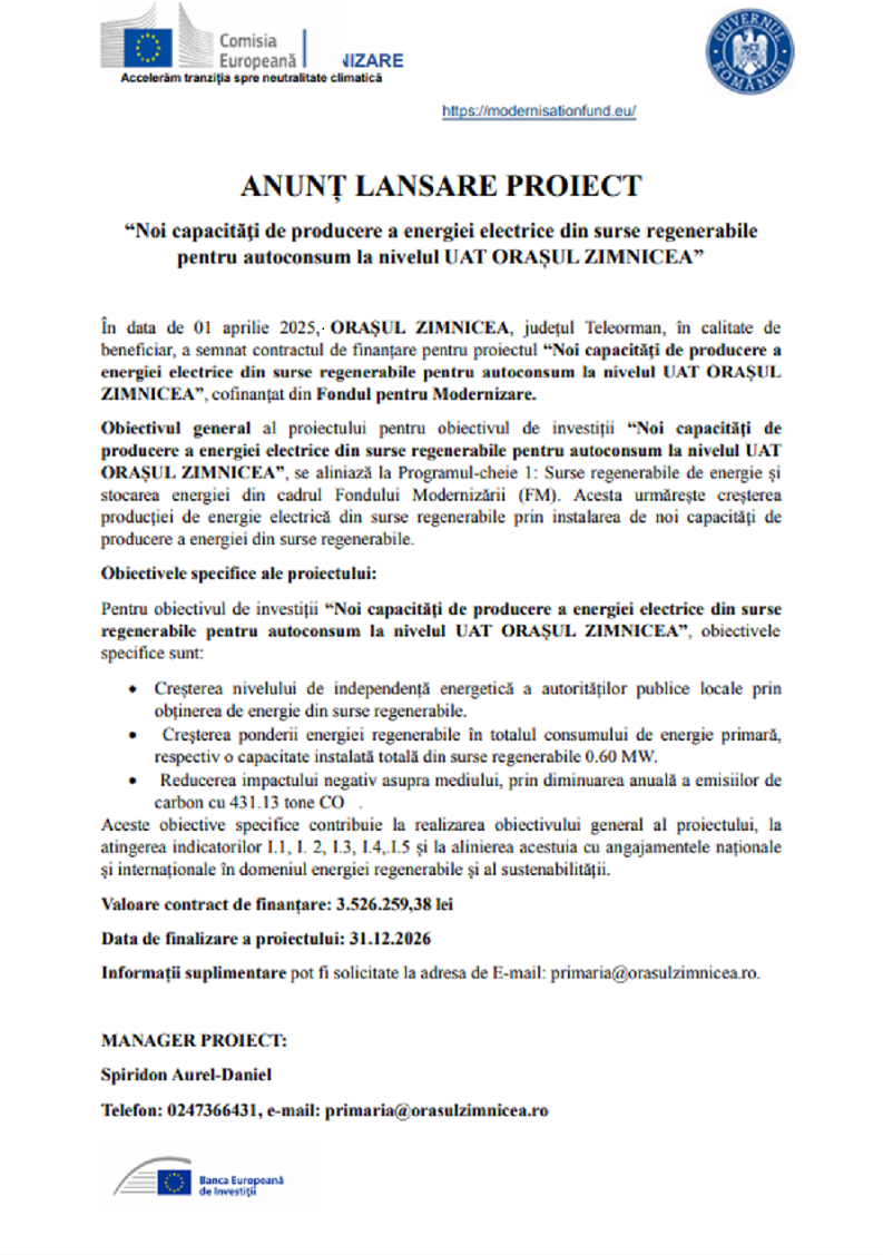 În data de 01 aprilie 2025, ORAȘUL ZIMNICEA, județul Teleorman, în calitate de beneficiar, a semnat contractul de finanțare pentru proiectul “Noi capacităţi de producere a energiei electrice din surse regenerabile pentru autoconsum la nivelul UAT ORAȘUL ZIMNICEA”, cofinanțat din Fondul pentru Modernizare.